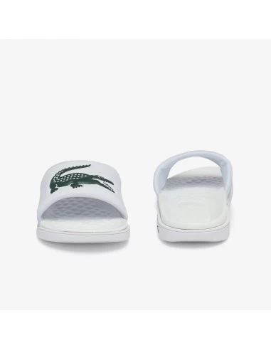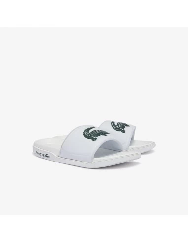 Découvrez ces claquettes de chez Lacoste full white avec son logo vert.